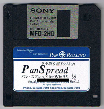 パンスプレッドVer1.1 サブタイトルが「サヤ取り屋ToolSoft」対応OSはWin95だ。当時サヤグラフを表示させる専用ソフトはこのソフト以外には皆無で、サヤ取りを実践する人が作ったサヤ取りソフトとして画期的なものだった。当時、うちにはMACしかなかったが、どうしてもパンスプレッドが使いたくて、そのためだけにIBMのノートを買った。フロッピーには、昔のパンローリングのロゴが印刷されており、シリアルナンバーは手書きだ(笑)。