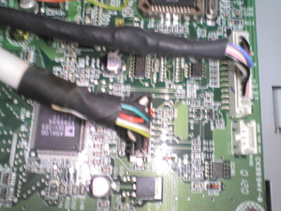 電源あたりの電解コンデンサーが、液漏れを起こしているのでは?と予想していたのだが、意に反して、コンデンサーはどれも綺麗だった。こりゃお手上げかも・・とあきらめかけたが、念のため、基盤のコネクタ類のゆるみをチェックしてみた。映像入力コードのコネクターを指で押してみると、ぐいっと中に入る感触があった。なんとコネクタが緩んでいた。このモニタは一度メーカーに修理に出しているので、その時にコネクタをちゃんと奥まで押し込んでいなかったのかも。とりあえず、バラしたモニタを組み立てて、接続すると、ちゃんと動作した。なんてこったい。その後、モニタは何事もなかったごとく普通に動作している。