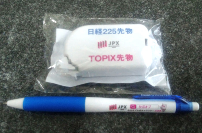 早速、自称、取引所グッズコレクターの私としては、JPXグッズをゲットしました。写真の上は、テープのりです。出口で配ってました。