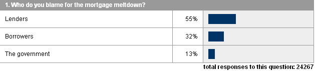 質問:住宅ローン業界が、惨憺たる状態に陥ったのは誰の責任? 回答: 貸した金融機関の責任 55% 借りた人の責任 32% 政府の責任 13% 回答数:24267 http://kabukeizainani.blogspot.com/ http://www.breakscan.com/usmw/