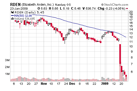1、米住宅市場危機は終わっていない。 2、米住宅ローン市場は、第2の津波に襲われる。 3、凍りついた金融市場。 4、更に悪化する銀行。 5、著しい個人消費の低下。 6、落ち込みを見せ始めたIT業界。 7、連邦政府による、膨大な資金注入にもかかわらず、なかなか回復の兆しが見えない景気。 個人消費の低迷を示す一例として、アダム・ヒュウィソン氏(ino.com)はエリザベス・アーデン (RDEN)をあげている。(エリザベス・アーデンは化粧品、スキンケア製品の小売店。 http://shop.elizabetharden.com/home/index.jsp) 下が日足チャートだ。 「女性たちは、口紅ではなく、生活必需品に金を回し始めたようだ」、とヒュウィソン氏は語っている。 (写真:エリザベス・アーデンのサイトから) (情報源: http://www.bloggingstocks.com/2009/01/23/your-stock-market-nightmare-isnt-over-7-reasons-the-market-is/)