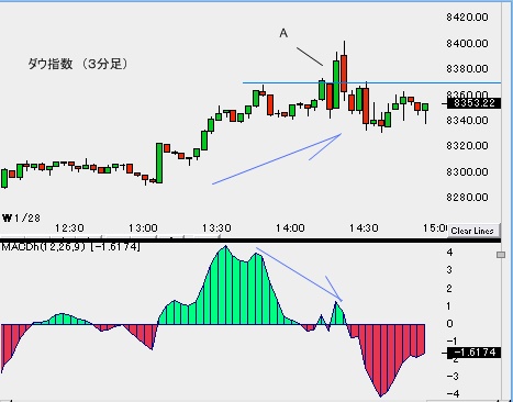 水曜のカリフォルニア・スーパー・ロットの賞金は6200万ドル、円に換算すると約55億8000万円だ。ロットに当たる確率は、飛行機の事故で死ぬ確率より低いというから、手元にあるチケットはおそらく外れに終わることだろう。 宝くじに関して、ジョージア大学は、こんな統計を発表している。 ・米国で最も頻繁に宝くじを買うのは黒人。非黒人と黒人を比較すると、黒人は非黒人を3倍ほど上回る確率で頻繁に宝くじを買う傾向がある。 ・男性と女性を比べると、4対1の割合で、男性の方が圧倒的に宝くじを買う。 ・高卒、高卒以下で比べた場合は、4対1の割合で、高卒以下の人が頻繁に宝くじを買う。 ・学歴の低い黒人男性と高学歴の非黒人女性を比較すると、30対1という圧倒的な割合で、学歴の低い黒人男性が頻繁に宝くじを買う。 さて、連銀は予想されたとおり、金利の誘導目標を据え置き、まったく大した話題にならなかったが、下はニュース発表直後のダウ指数の動きだ。 ニュースの直ぐ後(A)、ダウは高値を更新したが、このブレイクアウトで買うことにトレーダーたちは躊躇したことだろう。理由はダイバージェンスだ。矢印で分かるように、ダウは上げているのだが、反対にMACDのヒストグラムは下げている。攻撃的なトレーダーなら、このダイバージェンスを見て空売ったことだろう。 (情報源: http://www.walletpop.com/blog/2009/01/28/canadian-man-wins-14-million-in-lottery-and-hes-not-surprised/)