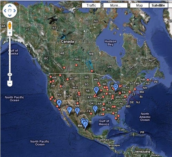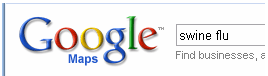 先ずGoogle Mapsにアクセスする。 http://maps.google.com/maps swine flu(豚インフル)で検索する。 すると、こんな地図が表示される。 A、B、Cのアルファベットは、豚インフルが報告された場所だ。