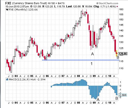ジム・ロジャーズ氏の見方が正しかったことを、先ず称賛したいと思う。米国経済に対して悲観的な意見を述べていた氏だが、去年の終わり頃、いちはやくドル強気論を発表した。 CNBCのインタビューで、ロジャーズ氏は最近こう語っている。 「私も、皆さんと同様に迷っている。私の基本的な姿勢は株を空売り商品を買うこと。そして現在検討していることはユーロの買い足しだ。現時点で言えることは、皆が皆ユーロに対して極めて悲観的な見方をしているということ。とにかく信じられないほど弱気論者が多く、ラリーはこんな状況でスタートするものだ。」 (businessinsider.comから抜粋) (チャート:www.dailymarkets.com) 上のチャートには、ユーロの建玉状況が示されている。 1の緑の線は小口トレーダー、そして注目したいのは、2の赤い線で示された投機筋と呼ばれるファンドなどの大口トレーダーの様子だ。最近やや上向きになっているが、見てのとおり、圧倒的に空売りポジションが多い。 下はユーロに連動するCurrencyShares Euro Trust (FXE)の日足チャートだ。 株価は下げているが、MACDのヒストグラムは既に上昇が始まり、ダイバージェンスと呼ばれる逆張りの買いシグナルが出ている。月足チャートも見てみよう。 今のところ115付近(1)がサポートになっている。 今月のローソク足が、まだ完全に形成されていないから断言することはできないが、株価に付けたA、BとMACDに付けたA、Bを比べてほしい。株価のBはAより低い位置にあるが、ヒストグラムのBはAより高い位置にありダイバージェンスが起きている。(繰り返しになるが、まだ今月のローソク足が出来上がっていない状態だから、ここから株価が崩れるようなことになれば、MACDのヒストグラムはAを下回る可能性がある。) ということで現時点では、試しに少しユーロを買ってみよう、という段階だと思う。 (情報源:Jim Rogers Jumps On The Nascent Euro-Bull Bandwagon ) ツイッター http://twitter.com/kamada3
