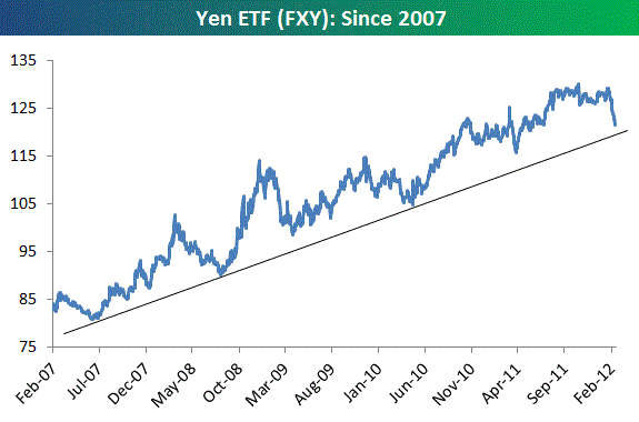 上は、日本円に連動する上場投信の長期チャートだ。2007年から今日までの動きが示されているが、最近の円の急落で、上昇するトレンドラインが直ぐそこに迫っている。円の絶好の買いチャンス、と解釈することもできるが、もちろん言うまでもなく大きなブレイクダウンというシナリオもある。