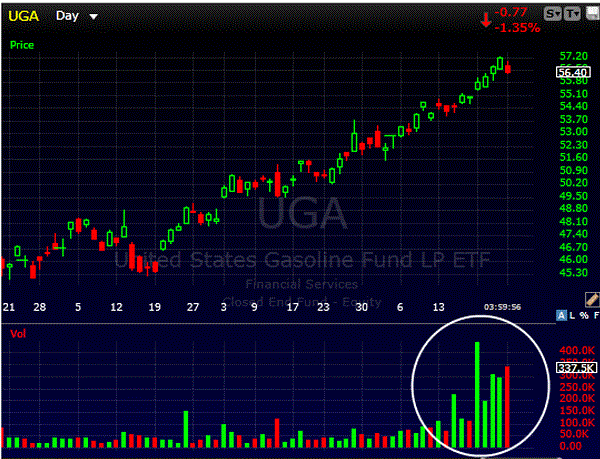 ガソリンに投資しているETFの先週の出来高には天井の兆候が見られる。(少なくとも、いよいよ最後のパニック買いが始まったようだ。)しかし、商品市場の墓場への道は、ここが天井だと空売った人々の骨で舗装されていることを忘れないでほしい。