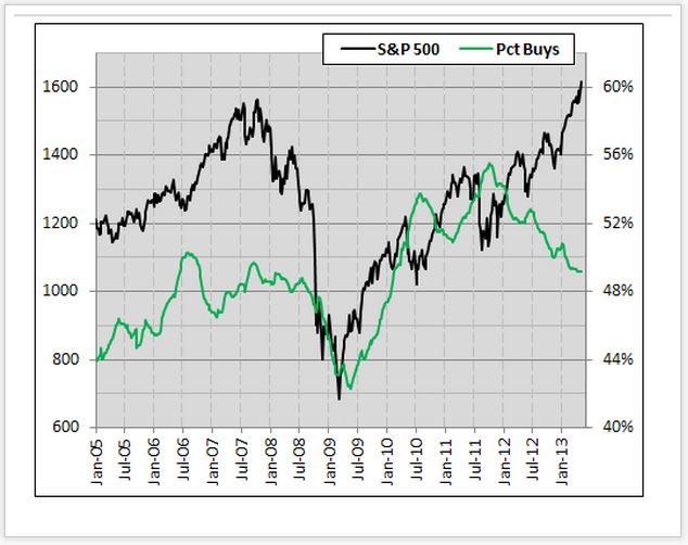 ¥À¥¦»Ø¿ô¤Ï1Ëü5000¤ÎÂçÂæ¤Ë¾è¤ê¡¢Êƹñ³ô¼°»Ô¾ì¤Ï¡¢¤Þ¤¹¤Þ¤¹¹¥Ä´¤À¡£¼ÂºÝ¤Î¿ô»ú¤Ç¸«¤ë¤È¡¢¥À¥¦»Ø¿ô¤Ï2009ǯ¤Î°ÂÃͤ«¤é2.3ÇܤÎÀ®Ä¹¤È¤Ê¤Ã¤Æ¤¤¤ë¤¬¡¢¤³¤Î¾å¾ºÁê¾ì¤Ë¤Ï¡Ö»Ë¾åºÇ¤â·ù¤ï¤ì¤Æ¤¤¤ë¾å¤²Áê¾ì¡×¤È¤¤¤¦Ì¾Á°¤¬ÉÕ¤±¤é¤ì¤Æ¤¤¤ë¡£ ¾å¤Î¥Á¥ã¡¼¥È¤Ï¡¢ºòÆü¡Ê12Æü¡Ë¥Ó¥¸¥Í¥¹¡¦¥¤¥ó¥µ¥¤¥À¡¼¤Ë·ÇºÜ¤µ¤ì¤Æ¤¤¤¿¤â¤Î¤À¡£³ô¤ËÅê»ñ¤·¤Æ¤¤¤ë¿Í¤¿¤Á¤Î¿ô¤¬¥Ñ¡¼¥»¥ó¥Æ¡¼¥¸¤Ç¼¨¤µ¤ì¤Æ¤¤¤ë¤¬¡¢¤³¤ì¤Ë¤Ä¤¤¤Æ¥Ç¥Ó¥Ã¥É¡¦¥í¡¼¥¼¥ó¥Ð¡¼¥°»á¡Ê¥°¥é¥¹¥¥ó¡¦¥·¥§¥Õ¤Î¥Á¡¼¥Õ¡¦¥¨¥³¥Î¥ß¥¹¥È¡Ë¤Ï¤³¤¦¸ì¤Ã¤Æ¤¤¤ë¡£ ºÇ¶áȯɽ¤µ¤ì¤¿¥Ç¡¼¥¿¤Ë¤è¤ë¤È¡¢52¡ó¤Î¥¢¥á¥ê¥«¿Í¤¬³ô¤ËÅê»ñ¤ò¤·¤Æ¤¤¤ë¡£¤³¤ì¤ÏÎò»ËŪ¤Ë¸«¤ÆÈó¾ï¤ËÄ㤤¿ôÃͤǤ¢¤ê¡¢1ǯÁ°¤Ï53¡ó¡¢¤½¤·¤Æ5ǯÁ°¤Ï62¡ó¤À¤Ã¤¿¡£³ô¤Î¶¯µ¤ÏÀ¼Ô¤¿¤Á¤Ï¡¢¤³¤ó¤Ê¤³¤È¤ò¸À¤¦¤À¤í¤¦¡£¡ÖÏ¢¶ä¤Ï¡¢¤â¤Ã¤ÈÀѶËŪ¤ËÎÌŪ´ËϤò¼Â»Ü¤¹¤ëɬÍפ¬¤¢¤ë¡£³ô¼°»Ô¾ì¤Ï³Î¤«¤Ë¹¥Ä´¤À¤¬¡¢¤³¤Î¾å¤²Áê¾ì¤«¤é²¸·Ã¤òÆÀ¤Æ¤¤¤ë¤Î¤ÏÊÆ¹ñ»Ô̱¤ÎȾʬ¤À¤±¤À¡£¸½ºß¤ÎÊÆ¹ñ¤Ë¤Ï¡¢»ñ»º¸ú²Ì¤¬½½Ê¬¤Ë¹¤Þ¤Ã¤Æ¤¤¤Ê¤¤¡£¡× ¾åµ¤·¤¿¤è¤¦¤Ë¡¢º£Æü¤Î¥Ö¥ë¥Þ¡¼¥±¥Ã¥È¤Ï¡¢¡Ö»Ë¾åºÇ¤â·ù¤ï¤ì¤Æ¤¤¤ë¾å¤²Áê¾ì¡×¤È¸Æ¤Ð¤ì¡¢¥é¥¤¥¢¥ó¡¦¥Ç¥È¥ê¥Ã¥¯»á¡Êschaeffersresearch.com¡Ë¤¬¥Ä¥¤¡¼¥È¤·¤¿¤³¤Î¥Á¥ã¡¼¥È¤òÀèÆü¤Î¥Ö¥í¥°¤ËºÜ¤»¤¿¡£ ¾å¾º¤·¤Æ¤¤¤ë¹õ¤¤Àþ¤ÏS&P500»Ø¿ô¡¢¤½¤·¤ÆÎФÎÀþ¤Ï¥¢¥Ê¥ê¥¹¥È¤ÎÇ㤤¿ä¾©¤À¡£2011ǯ¤Î½©¡¢S&P500»Ø¿ô¤Ë°¤¹¤ëÌÃÊÁ¤ÎÌó56¡ó¤ËÇ㤤¿ä¾©¤¬½Ð¤Æ¤¤¤¿¤¬¡¢·ë¶É¤½¤³¤¬¥Ô¡¼¥¯¤È¤Ê¤ê²¼¹ß¤¬»Ï¤Þ¤Ã¤Æ¤¤¤ë¡£Îɤ¯²ò¼á¤¹¤ì¤Ð¡¢¥¢¥Ê¥ê¥¹¥È¤¿¤Á¤Ï¿µ½Å¤Ë¤Ê¤ê¡¢¥¤¥ó¥¿¡¼¥Í¥Ã¥È³ô¥Ð¥Ö¥ë¤Î»þ¤Î¤è¤¦¤ËÇ㤤¿ä¾©¤òÍðȯ¤¹¤ë¤³¤È¤¬Ìµ¤¯¤Ê¤Ã¤¿¡£¤·¤«¤·¸Ä¿ÍÅê»ñ²È¤ÎΩ¾ì¤«¤é¸«¤ë¤È¡¢¤¿¤È¤¨¥Þ¡¼¥±¥Ã¥È¤¬¾å¾º¤·¤Æ¤¤¤Æ¤â¡¢Ç㤤¿ä¾©¤¬¸º¤Ã¤Æ¤¤¤ë¾õ¶·¤Ç¤Ï³ô¤ÎÇ㤤¤òí´í°¤·¤Æ¤·¤Þ¤¦¡£ ³ô¤Ï¼«Ê¬¤ÎȽÃǤǤä¤ë¤â¤Î¤À¤¬¡¢Â¿¤¯¤Î¿Í¤¿¤Á¤ÏȽÃǤò¤¹¤ë¤¿¤á¤Ë¥¢¥Ê¥ê¥¹¥È¤äÅê»ñ¥¢¥É¥Ð¥¤¥¶¡¼¡¢¤½¤ì¤Ë·ÐºÑ³Ø¼Ô¤¿¤Á¤Î°Õ¸«¤ò»²¹Í¤Ë¤¹¤ë¡£Â¾¿Í¤ËÀÕǤ¤ò²¡¤·ÉÕ¤±¤ë¤Ä¤â¤ê¤Ï¤Ê¤¤¤¬¡¢¥¸¥ç¥·¥å¥¢¡¦¥Ö¥é¥¦¥ó»á¤Î¸«Êý¤Ë¤Ï°ìÍý¤¢¤ë¤È»×¤Ã¤¿¡£ ¿¤¯¤Î¿Í¤¿¤Á¤Ï¡¢¤Ê¤¼¤³¤ÎÂ礤ʾ徺Áê¾ì¤Ë¾è¤ë¤³¤È¤¬¤Ç¤¤Ê¤«¤Ã¤¿¤Î¤À¤í¤¦¤«¡©¥¤¥ó¥Õ¥ì¡¢¥Ç¥Õ¥ì¡¢¥¥ã¥Ô¥¿¥ë»Ô¾ì¤ÎÊø²õ¤Ê¤É¤È¤¤¤Ã¤¿¶²¤í¤·¤¤ÀìÌç²È¤ÎͽÁÛ¤ä°Õ¸«¤Ë´ð¤¤¤Æ¡¢¸Ä¿ÍÅê»ñ²È¤¿¤Á¤Ï»ý¤Á³ô¤òÇä¤Ã¤Æ¤·¤Þ¤Ã¤¿¡£¤³¤ÎÀÕǤ¤Ï¡¢¤¤¤Ã¤¿¤¤Ã¯¤¬¼è¤ë¤Î¤À¤í¤¦¤«¡© ¸í²ò¤òÈò¤±¤ë¤¿¤á¤Ë°ì¸ÀÉÕ¤±²Ã¤¨¤ë¤È¡¢¥¸¥ç¥·¥å¥¢¡¦¥Ö¥é¥¦¥ó»á¤Ï¡¢Âç½°¤¬¾å¤²Áê¾ì¤Ë¾è¤ì¤Ê¤«¤Ã¤¿¤Î¤Ï¥¢¥Ê¥ê¥¹¥È¤ä¥¢¥É¥Ð¥¤¥¶¡¼¤ËÁ´ÀÕǤ¤¬¤¢¤ë¤È¸À¤Ã¤Æ¤¤¤ëÌõ¤Ç¤Ï¤Ê¤¤¡£¥Ö¥é¥¦¥ó»á¼«¿È¡¢¤³¤Î¾å¤²Áê¾ì¤¬²¿¸Î¤³¤ì¤Û¤É¤Þ¤ÇÂç½°¤Ë̵»ë¤µ¤ì¤Æ¤¤¤ë¤Î¤«¤¬Ê¬¤«¤é¤Ê¤¤¾õÂÖ¤À¡£ ¥¤¥ó¥¿¡¼¥Í¥Ã¥È³ô¥Ð¥Ö¥ë¤ÇÂ绡¢¶âÍ»´íµ¡¤ÇÂ绤·¤¿¿Í¤¿¤Á¤Ï¡¢º£Æü40Âå¡¢50Âå¤Î¿Í¤¿¤Á¤À¡£Æ¯¤À¹¤ê¤ÎǯÎðÁؤǤ¢¤ê¡¢¤½¤ì¤Ê¤ê¤Î¸Ä¿Í»ñ»º¤â¤¢¤ëÀ¤Âå¤Ê¤Î¤À¤¬¡¢ÆóÅÙ¤âÄˤ¤·Ð¸³¤¬¤¢¤ë¤À¤±¤Ë¡¢¤â¤¦³ô¤Ï¤³¤ê¤´¤ê¤È¤¤¤Ã¤¿¾õÂÖ¤À¡£Èà¤é¤¬³ô¤ò¤ä¤ê¤¿¤¯¤Ê¤¤¤Î¤Ïʬ¤«¤ë¤¬¡¢¤½¤ì°Ê³°¤ÎÀ¤Âå¤â³ô¤ò¤ä¤ëµ¤¤Ë¤Ê¤ì¤Ê¤¤¤Î¤Ï²¿¸Î¤À¤í¤¦¤«¡©Ã±¤Ë³ô¼°»Ô¾ì¤Ë¸¸ÌǤ·¤¿¤À¤±¤À¤í¤¦¤«¡©¤½¤ì¤È¤â¡¢º£Æü¤Î¥¢¥á¥ê¥«¿Í¤Ë¤Ï¡¢³ô¤òÇ㤦;͵¤Ê¤É̵¤¤¤È¤¤¤¦¤³¤È¤Ê¤Î¤À¤í¤¦¤«¡©¤É¤¦¤â¤è¤¯Ê¬¤«¤é¤Ê¤¤¡£ ¡Ê»²¾È¤·¤¿¥µ¥¤¥È¡§The Saddest Thing About This Epic Stock Market Rally Bearish Pundits Complain That Too Many People Listened To Them¡Ë