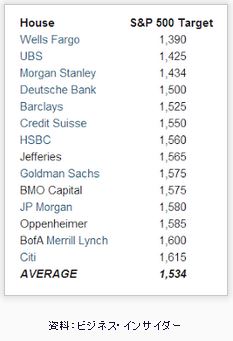 2012ǯ12·î31Æü¡¢S&P500»Ø¿ô¤Î½ªÃͤÏ1426.19¤À¤Ã¤¿¡£Àè½µ¶âÍˤνªÃͤÏ1667.47¤À¤«¤é¡¢S&P500»Ø¿ô¤Ï16.9¡ó¤Î¾å¾º¤À¡£ ¥¢¥Ê¥ê¥¹¥È¤¿¤Á¤Ï¡¢2013ǯ¤Î¥Þ¡¼¥±¥Ã¥È¤ò¡¢¤É¤¦Í½ÁÛ¤·¤Æ¤¤¤¿¤Î¤À¤í¤¦¤«¡©²¼¤Ï¡¢Âç¼ê¶âÍ»µ¡´Ø¤Î¥¢¥Ê¥ê¥¹¥È¤¬È¯É½¤·¤¿¡¢º£Ç¯¤ÎS&P500»Ø¿ô¤ÎÌÜɸÃͤÀ¡£¡Ê¿ôÃͤϡ¢2013ǯ¤ÎS&P500»Ø¿ô¤Î½ªÃͤòͽÁÛ¤·¤¿¤â¤Î¡£¡Ë À褺¡¢°ìÈÖ¾å¤ÎWells Fargo¤ò¸«¤Æ¤ß¤è¤¦¡£1390¤È¤¤¤¦¼åµ¤¤ÊͽÁÛ¤À¡£¤³¤ÎͽÁÛ¤¬ÅªÃ椹¤ë¤¿¤á¤Ë¤Ï¡¢S&P500»Ø¿ô¤Ï¡¢¶âÍˤνªÃͤ«¤é16¡ó¤Û¤É²¼Í¤ëɬÍפ¬¤¢¤ë¡£ ºÇ¤â³Ú´ÑŪ¤ÊÌÜɸÃͤòȯɽ¤·¤¿¤Î¤ÏCiti¤Î¥¢¥Ê¥ê¥¹¥È¤À¡£Í½ÁÛ¤µ¤ì¤ëº£Ç¯¤Î½ªÃͤÏ1615¤À¤«¤é¡¢S&P500»Ø¿ô¤Ï´û¤ËÌÜɸ¤Ë㤷¤Æ¤¤¤ë¡£¸À¤¤´¹¤¨¤ë¤È¡¢Citi¤Î¥¢¥Ê¥ê¥¹¥È¤Î¸«Êý¤¬Àµ¤·¤¤¾ì¹ç¤Ï¡¢º£Ç¯¸åȾ¤Î¥Þ¡¼¥±¥Ã¥È¤ÏÎɤ¯¤Æ²£¤Ð¤¤¤À¡£ ¥¢¥Ê¥ê¥¹¥È¤¿¤Á¤ÎͽÁÛÊ¿¶ÑÃÍ¡ÊAVERAGE¡Ë¤Ï1534¤À¡£¤³¤ÎͽÁÛ¤¬¼Â¸½¤¹¤ë¤¿¤á¤Ë¤Ï¡¢¶âÍˤνªÃͤ«¤éS&P500»Ø¿ô¤Ï8¡ó¤Û¤É²¼¤²¤ëɬÍפ¬¤¢¤ë¡£ ¥Ó¥¸¥Í¥¹¡¦¥¤¥ó¥µ¥¤¥À¡¼¤Ï¤³¤¦½ñ¤¤¤Æ¤¤¤ë¡£ º£Ç¯¤ËÆþ¤Ã¤Æ¤«¤é¡¢¥¢¥Ê¥ê¥¹¥È¤¿¤Á¤Ï¹Í¤¨¤òÊѤ¨¡¢¼¡¡¹¤ÈͽÁÛÃͤÎÊѹ¹È¯É½¤À¡£¤â¤Á¤í¤ó¡¢Í½Áۤɤª¤ê¥Þ¡¼¥±¥Ã¥È¤ÏºÇ½ªÅª¤Ë²¼¤²¤ë¡¢¤È°Õ¸«¤òÊѤ¨¤Ê¤¤¥¢¥Ê¥ê¥¹¥È¤â¤¤¤ë¡£¤É¤Á¤é¤Ë¤·¤Æ¤â¡¢¥¢¥Ê¥ê¥¹¥È¤Î°Õ¸«¤ò»²¹Í¤ËÅê»ñ¤·¤Æ¤¤¤¿¸Ä¿ÍÅê»ñ²È¤¿¤Á¤â°Õ¸«¤Î½¤Àµ¤¬É¬ÍפÀ¡£¡ÊÎ㤨¤Ð¥´¡¼¥ë¥É¥Þ¥ó¡¦¥µ¥Ã¥¯¥¹¤Ï¡¢Í½ÁÛÃͤò1575¤«¤é1625¤Ë¾åÊý½¤Àµ¤·¤Æ¤¤¤ë¡£¡Ë ¼¡¤Ë¡¢Ëè½µAAII¤«¤éȯɽ¤µ¤ì¤ë¡¢¸Ä¿ÍÅê»ñ²È¤¿¤Á¤Î¶¯µ¤¥»¥ó¥Á¥á¥ó¥È¤ò¸«¤Æ¤ß¤è¤¦¡£ ²¼È¾Ê¬¤¬¶¯µ¤¥»¥ó¥Á¥á¥ó¥È¡Ê5·î16Æü»þÅÀ¡Ë¤À¡£º£²ó¤Î¿ôÃͤÏ38¡ó¤È¤Ê¤ê¡¢¾å¾º¤¹¤ë¥Þ¡¼¥±¥Ã¥È¤È¤ÏÈ¿ÂФˡ¢Á°²ó¤Î41¡ó¤«¤é3¥Ý¥¤¥ó¥È²¼¤¬¤Ã¤Æ¤¤¤ë¡£¤È¤¤¤¦Ìõ¤Ç¡¢¥Þ¡¼¥±¥Ã¥È²áÇ®¤ò¼¨¤¹50¡ó¤Ë㤹¤ë¤³¤È¤Ê¤¯¶¯µ¤¥»¥ó¥Á¥á¥ó¥È¤Ï²¼¤¬¤Ã¤Æ¤·¤Þ¤Ã¤¿¡£Îɤ¯²ò¼á¤¹¤ì¤Ð¡¢¸Ä¿ÍÅê»ñ²È¤¿¤Á¤ÏÎäÀŤÀ¡£ ¡Ê»²¾È¤·¤¿¥µ¥¤¥È¡¿µ»ö¡§ Literally Every Strategist On Wall Street Has Been Wrong About The Stock Market WALL STREET: Here's What The S&P 500 Will Do This Year SentimenTrader¡Ë
