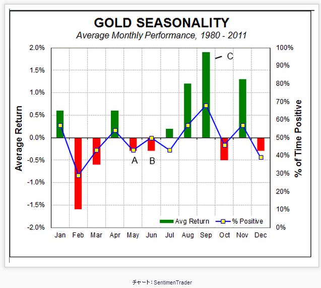 Ï¢µÙ¤Î½µËö¡¢¤½¤·¤ÆÊƹñ¤Ï²ÆµÙ¤ß¤¬»Ï¤Þ¤ê¤Þ¤¹¡£²Æ¤È¸À¤¨¤Ð¥Ð¡¼¥Ù¥¥å¡¼¤È¥Ó¡¼¥ë¡¢³Ú¤·¤¤µ¨Àá¤Ç¤¹¡£ ¤³¤³¤ÇÏäϤ¤¤¤Ê¤ê¶â¤ËÊѤï¤ê¤Þ¤¹¡£²¼¤Ï¶â¤ÎETF¡ÊSPDR Gold Trust¡Ë¤ÎÆüÂ¥Á¥ã¡¼¥È¤Ç¤¹¡£ ²¼¹ß¤¹¤ë50Æü°Üưʿ¶ÑÀþ¡ÊÀ֡ˤÇʬ¤«¤ë¤è¤¦¤Ë¡¢¥È¥ì¥ó¥É¤Ï²¼¤²Êý¸þ¤Ç¤¹¡£1¡¢2¤È¿ô»ú¤òÆþ¤ì¤Þ¤·¤¿¤¬¡¢Ç㤤¼ê¤Î´üÂÔ¤ÏÆóÈÖÄ줬·ÁÀ®¤µ¤ì¤ë¤³¤È¤Ç¤¹¡£¤¿¤·¤«¤Ë¡¢·îÍˤÏŤ¤ÍÛÀþ¡ÊA¡Ë¤¬½ÐÍè¾å¤¬¤ê¡¢¤¤¤è¤¤¤è¥é¥ê¡¼³«»Ï¤«¤È¶½Ê³¤·¤¿¿Í¤â¤¤¤¿¤è¤¦¤Ç¤¹¤¬¡¢¤½¤Î¸å¤ÏÁ´¤¯¥Ñ¥Ã¤È¤·¤Ê¤¤Å¸³«¤Ç¤¹¡£ ¸½»þÅÀ¤Ç¤Ï¡¢¶â¤¬ÆóÈÖÄì¤ò·ÁÀ®¤·¤Æ¤¤¤ë¤«¤É¤¦¤«¤Ïʬ¤«¤ê¤Þ¤»¤ó¡£¤½¤ì¤¬³Îǧ¤Ç¤¤ë¤Î¤Ï¾å¸Â¡ÊA¡Ë¤ÎÆÍÇˤǤ¹¡£¤â¤·¾å¸Â¤ò±Û¤¨¤¿¾ì¹ç¤Ï¡¢A¤«¤éB¤Þ¤Ç¤Î¿¼¤µ¤ËÁêÅö¤¹¤ë¾å¾º¤¬´üÂԤǤ¤Þ¤¹¡£¤·¤«¤·¡¢ÌäÂê¤Ï¤³¤ì¤Ç¤¹¡£ ²ÖÅĤµ¤ó¤Î¥Ä¥¤¡¼¥È¤Ç¤¹¤¬¡¢¶â¤Î¶õÇä¤ê»Ä¹â¤¬»Ë¾åºÇ¹â¤Ë㤷¤Æ¤¤¤Þ¤¹¡£Å°ÄìŪ¤Ë¶â¤Ï¶õÇä¤é¤ì¤Æ¤¤¤ë¾õÂ֤Ǥ¹¤«¤é¡¢¤Ê¤«¤Ê¤«¾å¾º¤¹¤ë¤³¤È¤¬¤Ç¤¤Þ¤»¤ó¡£¤â¤Á¤í¤ó¡¢¶õÇä¤Ã¤¿¤â¤Î¤ÏÇ㤤Ì᤹ɬÍפ¬¤¢¤ê¤Þ¤¹¤«¤é¡¢¤â¤·¶â¤¬A¤Î¾å¸Â¤òÆÍÇˤ¹¤ë¤è¤¦¤Ê¤éµÞ¥Ô¥Ã¥Á¤ÊÇ㤤Ìᤷ¤¬µ¯¤¡¢¤³¤ÎETF¤ò´û¤ËÊÝͤ·¤Æ¤¤¤ë¿Í¤¿¤Á¤¬´üÂÔ¤¹¤ë¥·¥ç¡¼¥È¥¹¥¯¥¤¡¼¥º¡ÊƧ¤ß¾å¤²¡Ë¤¬Å¸³«¤µ¤ì¤ë²ÄǽÀ¤¬¤¢¤ê¤Þ¤¹¡£ µ¨ÀáŪ¤Ë¸«¤¿¾ì¹ç¤Ç¤¹¤¬¡¢¶Ëü¤Ê²¼¤²¤Ç¤Ï¤¢¤ê¤Þ¤»¤ó¤¬¡¢ÀÖ¤¤ËÀ¤Çʬ¤«¤ë¤è¤¦¤Ë5·î¡ÊA¡Ë¤È6·î¡ÊB¡Ë¤Î¶â¤Ï²¼¤²¤ë·¹¸þ¤¬¤¢¤ê¤Þ¤¹¡£¡Ê¶â¤¬ºÇ¤â¹¥Ä´¤Ê¤Î¤Ï9·î¡ÊC¡Ë¤Ç¤¹¡£¡Ë¡ÊÃí¡§±¦Â¦¤Î¡ó¤Ï³Æ·î¤Î¶â¤¬¾å¾º¤¹¤ë³ÎΨ¤ò¼¨¤·¡¢º¸Â¦¤Î¡ó¤Ï³Æ·î¤Î¶â¤ÎÊ¿¶Ñ¿¤ÓΨ¤¬¼¨¤µ¤ì¤Æ¤¤¤Þ¤¹¡£¡Ë µ¨ÀáŪ¤Ë¤ÏÂ礷¤¿´üÂԤϤǤ¤Þ¤»¤ó¤¬¡¢»Ë¾åºÇ¹â¤Î¶õÇä¤ê»Ä¹â¡¢¤½¤ì¤ËÆóÈÖÄì¤Î²ÄǽÀ¤¬¤¢¤ê¤Þ¤¹¤«¤é¡¢Â¿¤¯¤ÎÅê»ñ²È¤¬¶â¤Îư¤¤ËÃíÌܤ·¤Æ¤¤¤ë¤³¤È¤Ç¤·¤ç¤¦¡£ ¤½¤·¤Æ¡¢¤â¤¦°ì¤Ä»ØÅ¦¤·¤¿¤¤¤³¤È¤¬¤¢¤ê¤Þ¤¹¡£ ÆüÂ¥Á¥ã¡¼¥È¤ò³ÈÂ礷¤¿¤â¤Î¤Ç¤¹¤¬¡¢º£Æü¤Î¥í¡¼¥½¥¯Â¤ÏNR7¤Ç¤¹¡£¡ÊNR7¡§ºÇ¶á7Æü´Ö¤ÇºÇ¤âÃÍÉý¤¬¶¹¤¤¥í¡¼¥½¥¯Â¡ËNR7¤Î¥È¥ì¡¼¥ÉÊýË¡¤Ï¶Ë¤á¤Æ´Êñ¤Ç¤¹¡£¤â¤·¹âÃÍ¡Ê1¡Ë¤òÆÍÇˤʤéÇ㤤¡¢¤â¤·°ÂÃÍ¡Ê2¡Ë¤ò³ä¤ë¤è¤¦¤Ê¤é¶õÇä¤ê¤Ç¤¹¡£¤â¤Á¤í¤ó¡¢¹âÃͤòÆÍÇˤ·¤¿¸å¤¹¤°¤Ë¼ºÂ®¤È¤Ê¤ê¡¢°ÂÃͤò³ä¤ë¤È¤¤¤¦Å¸³«¤â¤¢¤ë¤Î¤ÇÃí°Õ¤Ç¤¹¡£Ï¢µÙÌÀ¤±¤Î²ÐÍË¡¢¤Ï¤¿¤·¤Æ¥È¥ì¡¼¥À¡¼¤¿¤Á¤Ï¤É¤¦Æ°¤¯¤Ç¤·¤ç¤¦¤«¡£³Ú¤·¤ß¤Ç¤¹¡£