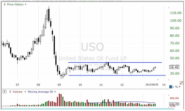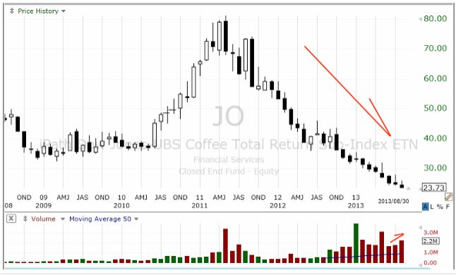 8月のマーケットが終了です。夏休みも終わり、いよいよ秋の相場が始まります。今月の月足が完成したので、あれこれと月足チャートを見ているところですが、何と言っても弱いのがコーヒーの上場投資証券(ETN)です。 2011年の5月がピークとなり、この2年間で66%の下落です。今月の出来高は6月と7月を上回り、相変わらず売り物が多い状況です。こんな下げ方ですから、買い手は完全に元気を失い、コーヒーは正に忘れられた存在になってしまいました。 大幅下落、忘れられた存在で思い出すのは天然ガスです。 天然ガスのETFですが、2008年7月から2012年4月までのベアマーケットで記録した下げは、95%という恐ろしい下げ幅です。こんなチャートを見る度に思うことは、素早い損切りの重要性です。最近は横ばいが続いています。これだけ下げた後ですから、この横ばいの次にやって来るのは、上放れだと思います。言い換えると、天然ガスは現在ステージ1の形成中です。 長期的に投資できる人なら、ステージ1で買うのが良いと思います。値動きは横ばいで退屈な展開ですから、急いで買う必要はありません。余談になりますが、人気株がテレビで取り上げられるのは、ほとんどの場合ステージ3です。 原油もステージ1と思われます。下は原油のETFです。 厳しい下げが終わり横ばいが続いています。 それと、海運株もステージ1です。 海運株のETFです。横ばいが続き、上げ相場への準備中といった感じがします。