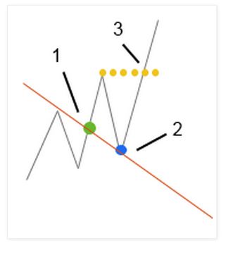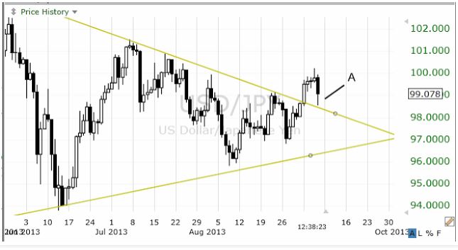 政府が発表する数字など信じらない、という声が多いですが、米雇用統計発表直後の為替市場は荒れます。たとえば、下はドル/円(5分足チャート)の動きです。 発表直後、長い陰線(1)が形成され、2のローソク足で分かりますが、ドル/円は98.55円付近まで下げたところで反発が始まっています。なぜ、ここで反発したのでしょうか。 上は日足チャートです。反発が起きた場所は三角形の上辺(A)です。ブレイクアウトの買い方法は3つあります。 1、ブレイクアウトと同時に買う。 2、トレンドラインに戻ったところで買う。 3、ブレイクアウト後に形成された高値突破で買う。 もう一度、ドル/円の日足チャートに戻りましょう。 1、ブレイクアウトでの買い。 2、上辺へ戻ったところでの買い。 3、次の買いは木曜の高値突破です。