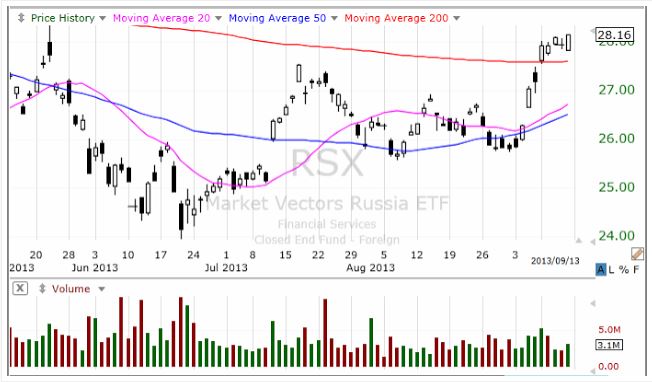 チャートを見ているところです。下はロシア株のETF、Market Vectors Russiaの日足チャートです。 先週、200日移動平均線(赤)を突破し、更なる上昇の可能性があります。下は週足チャートです。 リバース・ヘッド・アンド・ショルダーズの買いパターンが形成されているようです。既にネックラインを突破して買いシグナルが出ています。頭からネックラインまでの長さを使って測定すると、目標株価は31ドル付近です。(金曜の終値は28ドル16セント)