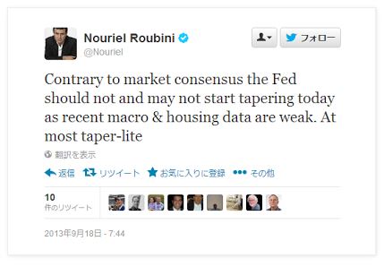 (下はゼロヘッジからの抜粋です。) マーク・ファーバー氏のコメント: ・FOMCが量的緩和の縮小に踏み切らなかった件について 100億から150億ドルの債券買い入れの縮小が決定されると予想していた。予想どおりの結果にはならなかったが、別に驚くことはなかった。バーナンキ議長を始めとするFRBの人々は学者であり、実際のビジネス現場で働いたことはない。だから彼らには、量的緩和から恩恵を受けるのは、ごく一部の人たちである、ということが分かっていない。量的緩和の縮小が見送られたことで、株式市場は1%の上昇、銀は6%を超える上昇、金は4%を超える上昇、そして原油が早速2.68%跳ね上がった。原油やガソリンは一般の人々の生活に欠かせないものであり、FRBのお陰で、暖房に必要な灯油などが高くなった。たしかに株も上がっているが、株に投資しているアメリカ人は、たったの11%だ。 ・国債の利回りについて 2012年9月14日に量的緩和第3弾が発表されて以来、量的緩和は第4弾に拡大され、今回の量的緩和縮小の見送りで、量的緩和は事実上無制限となった。米国の10年国債の利回りは1.43%で2012年7月25日に底打ちとなり、その当時の記者会見でバーナンキ氏は、「FRBの目標は低金利だ」、と述べていた。しかしそれ以来、利回りは2倍になり、FRBの目標とは正反対だ。 ・最終段階について 米国経済は完全な崩壊状態となる。連銀はドル紙幣を刷り続け、もし株式市場が10%の大幅下落といった状況になれば、更に大量なドル紙幣が刷られることだろう。連銀の知っている解決方法は量的緩和だけであり、結果的にこれが自分で自分の首を絞めることになる。 ・ジャネット・イエレン氏(次期FRB議長有力候補)について 穏健派として知られるバーナンキ議長だが、もしイエレン氏がFRB議長になったら、バーナンキ氏はタカ派に見えることだろう。2010年になるが、イエレン氏はマイナス金利に賛成する、と述べたことがあった。これが意味することは、たとえば銀行へ10万ドルを預けると、満期になって戻ってくる金額は元本以下だ。超低金利の継続は、政府がますます大きく巨大になることを意味し、人々からは自由が奪われる。 ・金について 債券買い入れ縮小の見送りで、株式市場が跳ね上がり、マーケットは買われすぎとなった。今日の上昇は一日だけの現象かもしれない。連銀は、国債市場をコントロールする力を既に失っている。問題は、連銀が株式市場をコントロールする力を失うのはいつになるかということだ。金のこれからの動きについては、もう少し様子を見てみたい。(ファーバー氏は、金は保険であり、全ての人は金を保有するべきだ、とも述べている。) ・国債(米10年債)の利回りについて 長期的に見た場合、利回りは上昇し、最終的には債務不履行となるだろう。短期的に見た場合は、国債は売られ過ぎであり、利回りは2.2%から2.5%に下がるだろう。ということで、私は国債を既に買っている。 マーク・ファーバー氏:スイス連邦チューリッヒ出身の投資アナリスト・投資アドバイザー。Marc Faber Limitedの創業者・社長(Managing Director)。1987年のニューヨーク株式市場の暴落を予見・警告していたことで有名になった。(ウィキペディアから) (参照した記事:Marc Faber Warns "The Endgame Is A Total Collapse - But From A Higher Diving Board Now")