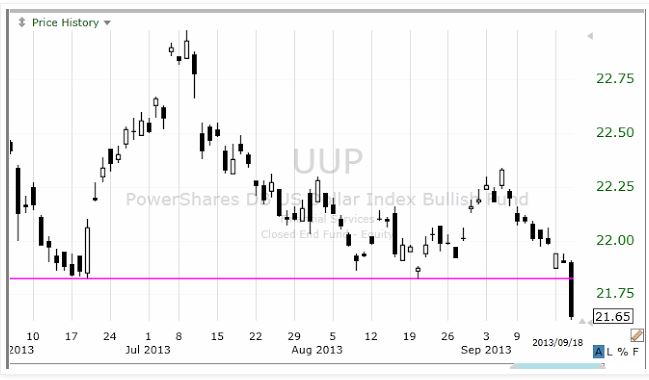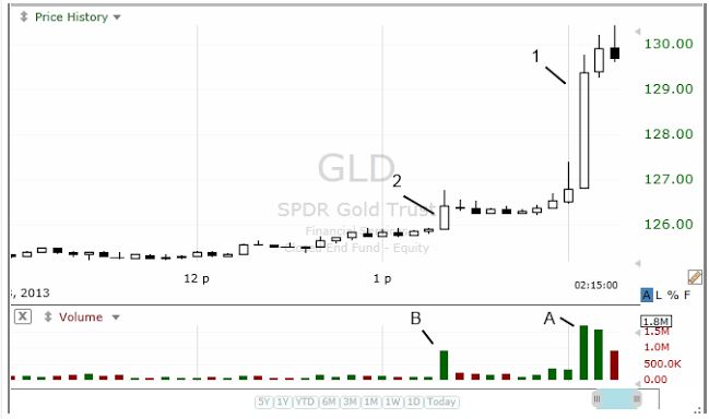 先週、ゴールドマン・サックスのアナリストは、こんなことを述べていた。 金価格の下落は今年だけでなく2014年も続くだろう。米国経済は回復方向にあり、FRBは現状のような金融緩和策を継続する必要が無くなる。来週のFOMCで、予想どおり債券買い入れ縮小が決定されれば、金の売りが加速することだろう。 しかし、予想された債券買い入れ縮小は無かった。 米FOMC、量的緩和の縮小見送り 雇用動向見極め(日本経済新聞) 下が、バーナンキ議長のコメントの要旨だ。 http://youtu.be/szwclmmKwLg 量的緩和の縮小は実施されないということで金に買いが殺到し、金のETFは+4.4%、そして金鉱株のETFは+8.83%の大幅上昇で水曜の取り引きを終えた。 FOMCからのメッセージは簡潔明瞭だ。現在の米国経済には独り歩きするほどの力は無い。ルービニ教授が、こんなツイートをしていた。 「市場予想とは反対になるが、最近の弱いマクロ経済と住宅市場のデータを考えると、FRBは量的緩和縮小を実施するべきではない。ひょっとすると今日のFOMCでは、縮小を実施しないということが決定されるかもしれない。もし縮小が決定されたとしても、それは小規模なものになるだろう。」 ほとんどの人たちは債券買い入れが縮小されることを予想していたから、ルービニ氏の意見は少数派だ。 金のETFのチャートを見てみよう。(5分足) FOMC終了直後に極めて大きな陽線(1)が形成された。跳ね上がった出来高(A)で分かるように、正に買い手の殺到だ。ゴールドマン・サックスが予想したように、債券買い入れ縮小という発表だったら大陰線が形成されたかもしれない。 気になるのは、FOMCが終了する45分前に形成された陽線(2)だ。短いローソク足が続いていたのに突然長い陽線が形成されただけでなく、出来高(B)も突出している。もちろん証拠は無いが、こんな陽線を見ると、FOMCの発表内容が漏れていたのでは、と疑ってしまう。 量的緩和の縮小見送りでドル指数がブレイクダウンとなった。 上はドル指数に連動するETF(日足)だが、サポートラインを大きく割り、ほぼ安値で終了した。このドル安で恩恵を受けたのは商品だ。 原油、トウモロコシ、金、銀などの商品に関連した株に投資しているETF、Jefferies TR/J CRB Global Commodity Equityの日足チャートを見てみよう。 長い陽線を形成し、長期トレンドを示す200日移動平均線(赤)を越えての終了だ。中期トレンドを示す50日移動平均線(青)は既に上昇が始まり、このまま上昇が続くと200日移動平均線を突破して、投資家たちにお馴染みのゴールデン・クロスが起きる。ということで商品市場の低迷が終わり、いよいよ上げ相場が到来したようだ。(注:Jefferies TR/J CRB Global Commodity Equityは出来高が少ないのでトレードには向いていない。) (参照した記事:米FOMC、量的緩和の縮小見送り 雇用動向見極め 迫るFOMC、不安な金投資家)