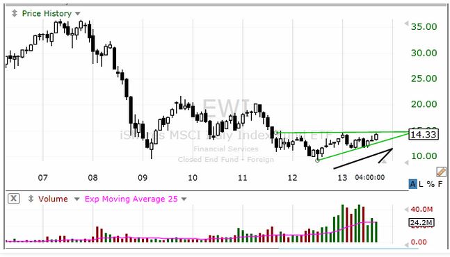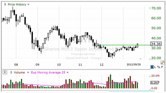 スタンレー・ドラッケンミラー: ヘッジファンド業界では長期投資で最高の実績を築いた1人。ポンド売りを仕掛けジョージ・ソロス氏に10億ドルをもたらしたことで知られる。2010年、運用会社デュケーヌ・キャピタル・マネジメントを閉鎖し、30年に及ぶキャリアに終止符を打った。(ブルームバーグ) 今週のFOMCで、量的緩和の縮小が決定されることを多くの人たちが予想していたが、その予想は外れた。ドラッケンミラー氏はこう強く語っている。 通常どおりの債券買い入れの継続が意味することは、中産階級と下層階級の所有する財産が、史上最大の規模で富裕層に再分配されるということだ。量的緩和の継続で、株や不動産は更に上昇することになる。しかし考えてほしい。株や不動産を所有しているのは中産階級、下層階級の人々ではなく富裕層に属する人々だ。 ドラッケンミラー氏のような資産家は、量的緩和のお陰で既に巨額な富を得ているが、氏はこんなことも述べている。 資産効果がハッピーエンドになることはない。テーパリング(量的緩和の縮小)が実際に始まれば、株や不動産は急速に下げる。下げ幅は、人々の予想を大きく上回ることだろう。量的緩和策が好結果に終わることはない。しかし中期的に見た場合、株はまだまだ上がる。 (上は、デイリー・ウェルスからの抜粋。) --------------------------------------------------------- とうぜんのことながら、株はまだまだ上がると言われても、全ての株が上がることはない。株は既に上がりすぎている、長期金利が上昇し始めている、といったことを理由に積極的に買うことが難しい現状だが、もしあえて買うならどんな株を買ったら良いだろうか? 「今日のような不安な状況では国際企業の株に投資するべきだ」、とCNBCに出演したクレーマー氏が言っていたが、これと似た考え方をするアドバイザー達が結構いる。彼らの意見を要約するとこうなる。 米国株式市場が、これから更に大幅上昇となるかは誰にも分からない。しかし一つ言えることは、米国株式市場は既に4年を超える上げ相場が展開され、この段階で大きく買うことには躊躇してしまう。言い換えれば、長期的に投資をするなら上げ相場の初期段階で買うことが好ましい。注目したいのはヨーロッパの株だ。ここ6週間ほどを振り返ってみると、ほとんどのヨーロッパの株式市場は52週間ぶりの高値を記録、または52週間ぶりの高値に迫り、本格的な上げ相場が始まろうとしている。 簡単にヨーロッパへ投資する方法として、アドバイザーたちはヨーロッパ株のETFを勧めている。例として、イタリア株のETF、iShares MSCI Italy Capped Index (EWI)の月足チャートを見てみよう。 底辺が上昇する三角形が安値圏に形成され、15ドル付近を走る上辺の突破に期待できそうだ。下はスペイン株のETF、iShares MSCI Spain Capped Index (EWP)の月足チャートだが、こちらは一足先にブレイクアウトしている。 スペイン、イタリアと言えば大きな財政問題を抱える二国だが、投資家たちは最悪の事態は過ぎ去った、と読んでいるようだ。 (参照した記事:Investing Legend: The Bull Market Is Going into "Extra Innings" Cramer: 'Cult' and international stocks the places to be)