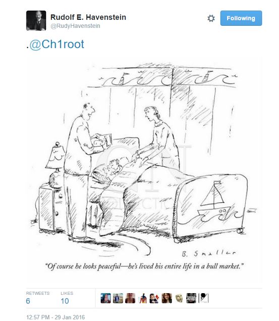 金曜のマーケットが終了しました。言うまでもなく、今日一番の話題は「日銀のマイナス金利導入」です。この驚きの措置に株は迅速に反応し、世界の株式市場は大幅上昇となりました。 世界の株式市場が大きく跳ね上がり、ビシネス・インサイダーは、こんな写真を掲載しています。 さて、ここで水をさすような、つならないことを一つ挙げます。下は、ダウ平均の日足チャートです。 注目はMACDです。パラメーターは3、10、16に設定してあります。リンダ・ラシュキ氏が有名にした3/10オシレーターですが、シグナルライン(1)とMACDライン(2)の位置を見てください。 シグナルラインはゼロライン(点線)より下にあり、これはダウ平均が売り基調にあることが示されています。今日のダウの大幅上昇で、今までゼロラインより下にあったMACDラインがゼロラインの上に復帰しました。これが意味するのは、空売りチャンスの到来です。 もちろん、今直ぐ空売れという意味ではなく、3/10オシレーターから発せられているメッセージは「空売りの準備をせよ」です。空売りのタイミングのつかみ方は、トレーダーによってまちまちです。ある人はローソク足のパターンからシグナルを得、あるトレーダーはストキャスティクスやRSIから買われすぎシグナルが出るのを待ちます。 空売りの湿った話はやめて、ツイッターで今日見つけた面白いツイートを最後に紹介したいと思います。 「息子が幸せそうに眠っているのは当たり前だよ。この子の今日までの人生は上げ相場の中で育ったのだから。」 (情報源:STOCKS SOAR: Here's what you need to know ツイート)