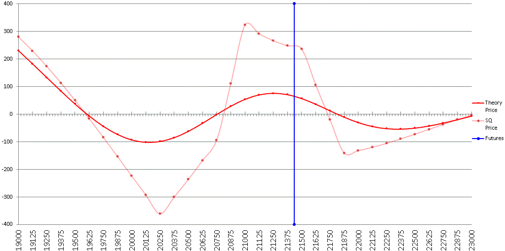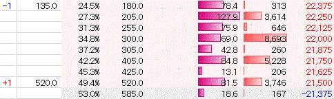 日経オプションの建玉の例題について説明します。 前日からの損益の変化は、こうなっています。 VIX指数は、下落、先物変わらずが続いています。 とりあえずは、外ベガ、期近ATMベガショートしていますが、 もう一日様子見とします。 ボラティリティーの動きが、分かりやすくなったら、 もう少しポジションを寝かしてもいいのではないかと思いますが、 SQ二週間前切ったので、期近の剥げが加速してくる時期というのを心掛けながら、 ポジションを建てなければいけないです。