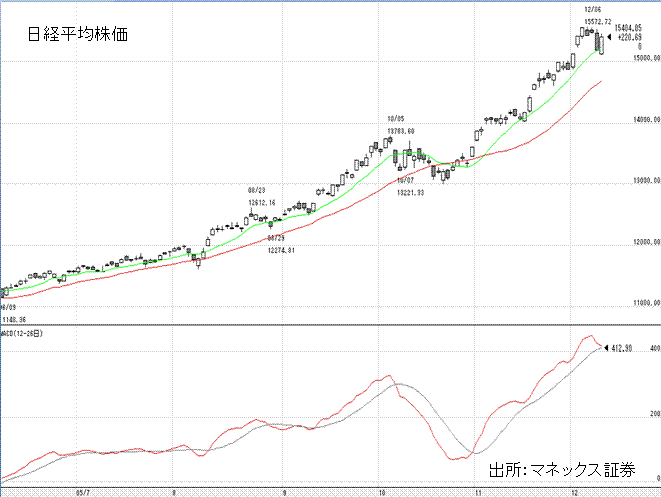 ご覧のように好調です。日経平均はずっと上がってきています。まず、MACDがシグナルを上から下に突き破るときを売りシグナルとします。どこかで聞いた覚えがありますね。移動平均線のゴールデンクロスとデッドクロスと考え方はほとんど同じです。MACDがシグナルを下から上に突き抜けるときが買いシグナルです。