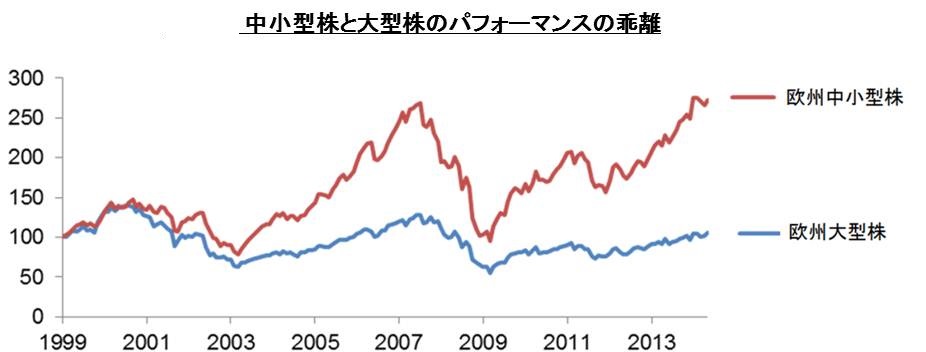 (出典)各種データベース (1)欧州中小型株は、1990年代終盤と2000年初のITブームの際、大型株に劣後したのですが、これはドット・コム・バブル崩壊による株価暴落のため、ドイツの新興市場であるノイア・マルクト(Neuer Markt)が廃止され( 2002年9月)、中小型株全体が不振となったから。 (2)過去15年の中で、投資対象が株式から債券に大きくシフトする局面では、より高いパフォーマンスを目指す株式ファンドや年金基金は、ベンチマーク外の中小型株の保有を増やす必要があったのですね。この間、大型株よりも組入需要の多かった中小型株のパフォーマンスは、相対的に好調に推移。 (3)2001年9月に起きた米国同時多発テロ、2008年9月に引き続いて発生したリーマン・ショックにより、各国中銀はかつてない金融緩和政策を導入。金融市場へ膨大な流動性が供給されたため、それまで流動性リスクを懸念して中小型株を組み入れられなかった投資家が、中小型株を投資対象にするようになりました。 (4)新興国需要の消費や鉱工業生産の増大、新市場の拡大や投資先企業による投資リターンの極大化といったビジネス環境の変化は、大型株よりも中小型株企業の業績全体や利益成長性により大きなインパクトを与えている。 なかなか実感が沸きませんが、ヨーロッパってたいしたもんなんだよね。サッカーも...、でしょ。(o^。^o)