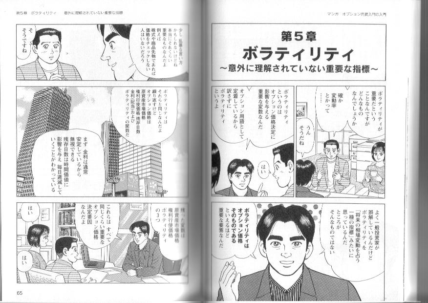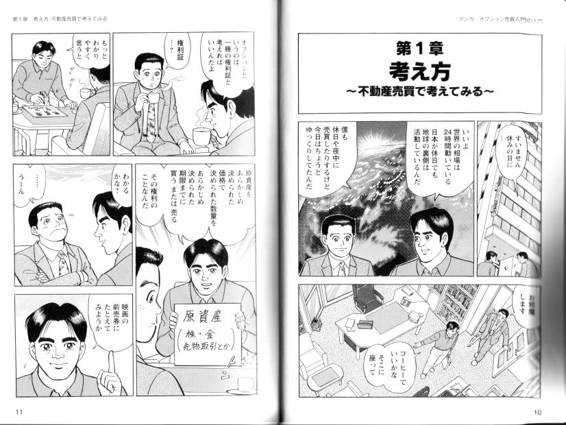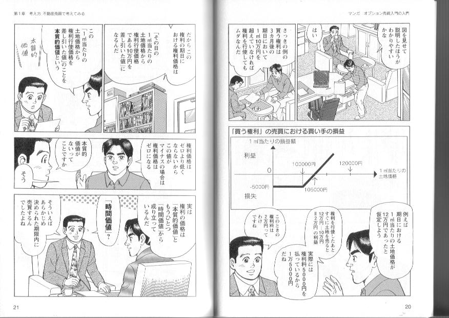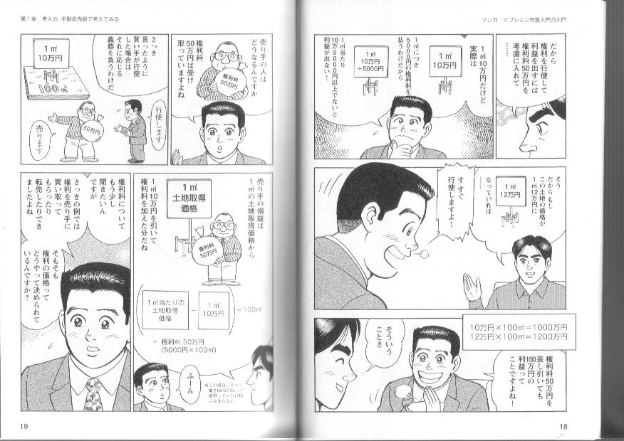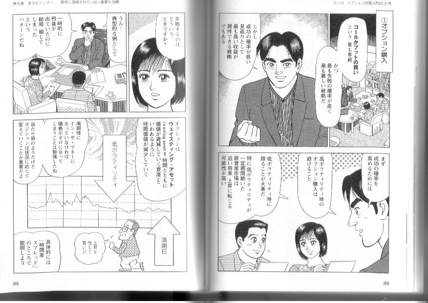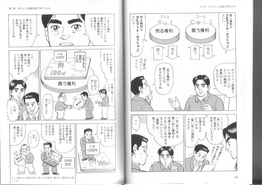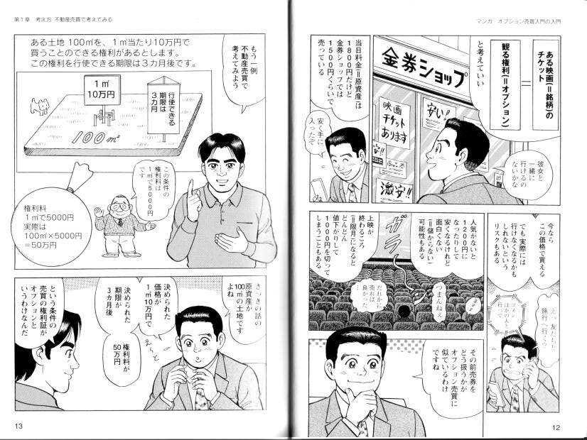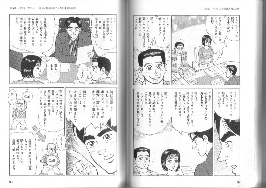 “入門書”としての『オプション売買入門』を著すにあたって私が最も配慮した点は、初心者にも分かり易い表現を用いることでした。しかしながら、この目的は十分に果たすことができなかったと反省しています。マンガ化することでこの欠点を補えるかどうかは、正直言いまして疑問です。なぜなら、マンガにおいても、オプションやオプション取引に関する説明の部分は原作とほとんど変わりがないからです。私が思うに、マンガによる最大の効果は、錯覚であるにせよ、読者が講師から直接説明を受けているような雰囲気に入り込んで、受身の姿勢ではなく、自ら身を乗り出して積極的に話の展開を追う中で自然と理解が深まるであろうということです。マンガにはそれなりのストーリーがあり、そのストーリーの展開の中にオプションの説明が入っています。そのため、読者は一見取っ付き難いオプションに関する話を案外身近なものとして受け留めることができるでしょう。