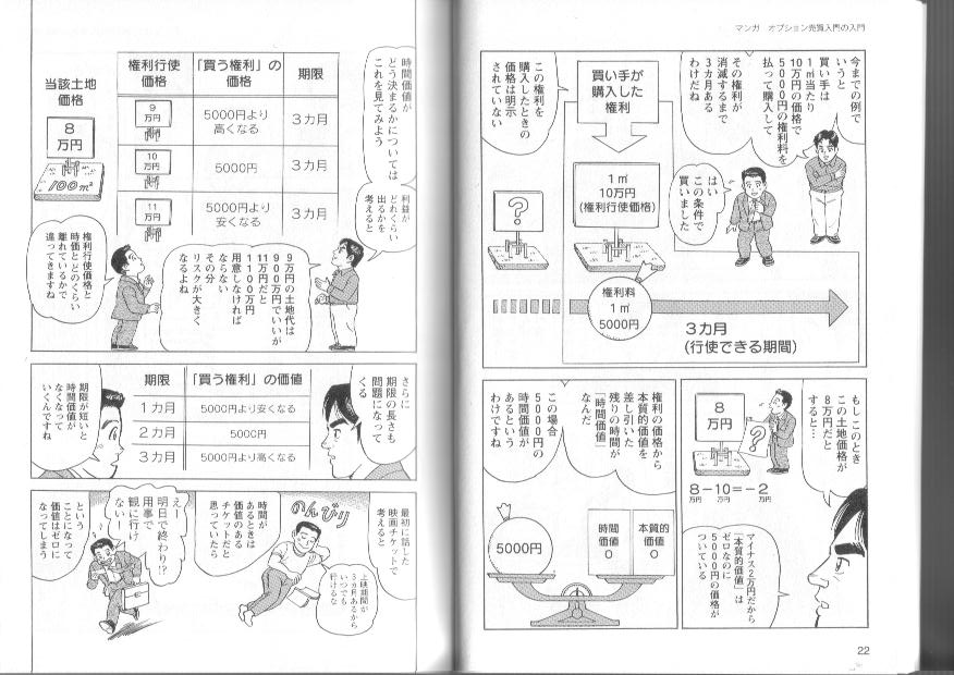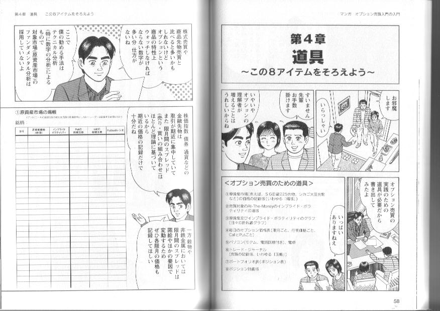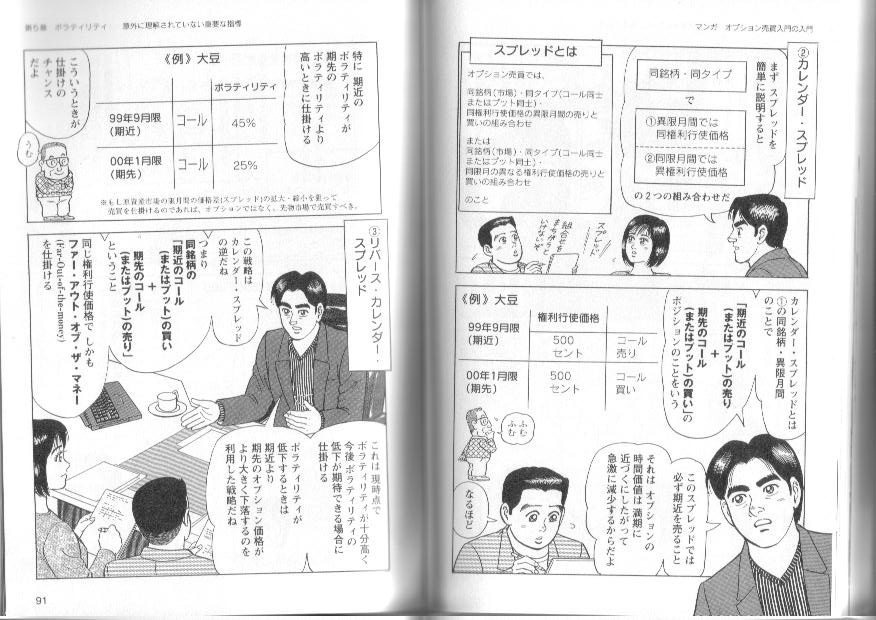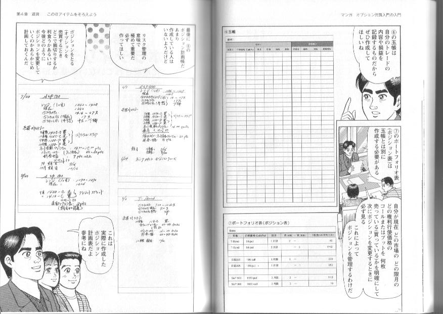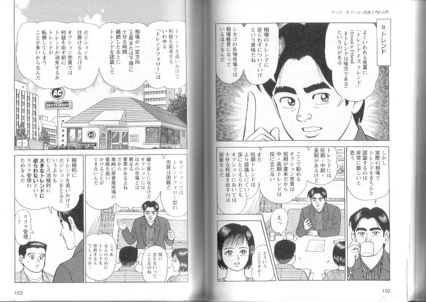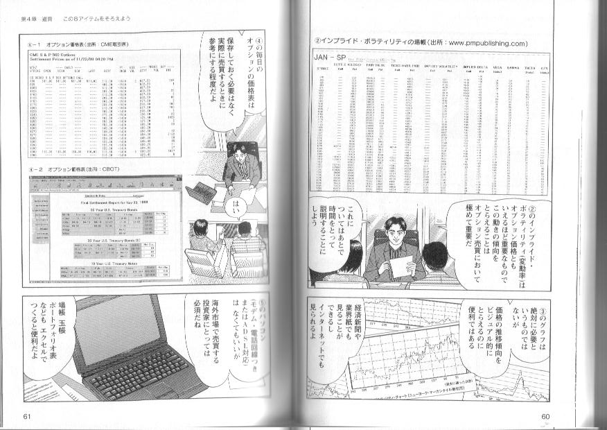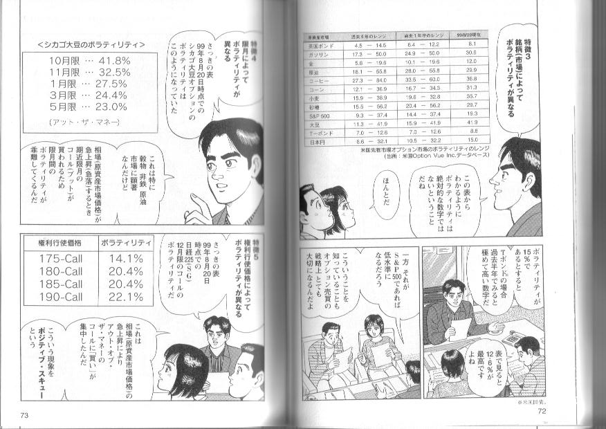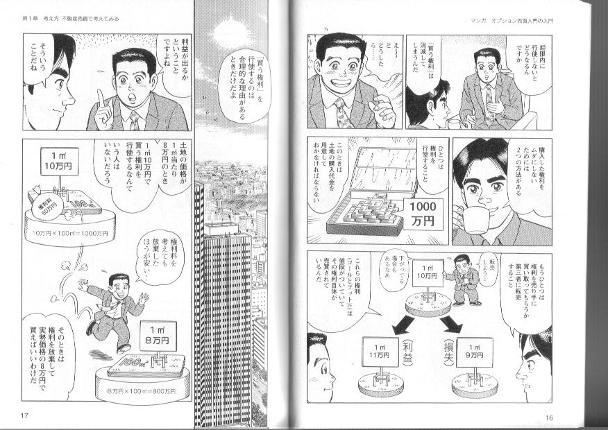 “入門書”としての『オプション売買入門』を著すにあたって私が最も配慮した点は、初心者にも分かり易い表現を用いることでした。しかしながら、この目的は十分に果たすことができなかったと反省しています。マンガ化することでこの欠点を補えるかどうかは、正直言いまして疑問です。なぜなら、マンガにおいても、オプションやオプション取引に関する説明の部分は原作とほとんど変わりがないからです。私が思うに、マンガによる最大の効果は、錯覚であるにせよ、読者が講師から直接説明を受けているような雰囲気に入り込んで、受身の姿勢ではなく、自ら身を乗り出して積極的に話の展開を追う中で自然と理解が深まるであろうということです。マンガにはそれなりのストーリーがあり、そのストーリーの展開の中にオプションの説明が入っています。そのため、読者は一見取っ付き難いオプションに関する話を案外身近なものとして受け留めることができるでしょう。