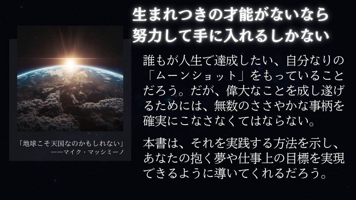 だれもが人生で達成したい自分なりの「ムーンショット」があるだろう。だが管制官の言うように、大きなことをひとつ成し遂げるということは、その過程で無数の小さなことを確実にやり遂げることを意味する。本書はそれらを実践・実現する方法を示し、あなたの個人的な夢や仕事上の目標を達成するために正しい道程に導いてくれるだろう。
