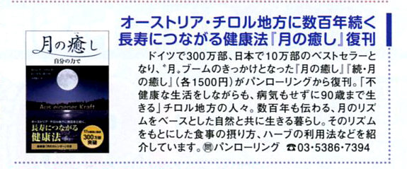本書では、月のリズムをもとにした正しい食事の摂り方、健康に役立つハーブの利用法など、毎日の生活の中で、実際に試すことのできるたくさんのヒントが紹介されている。