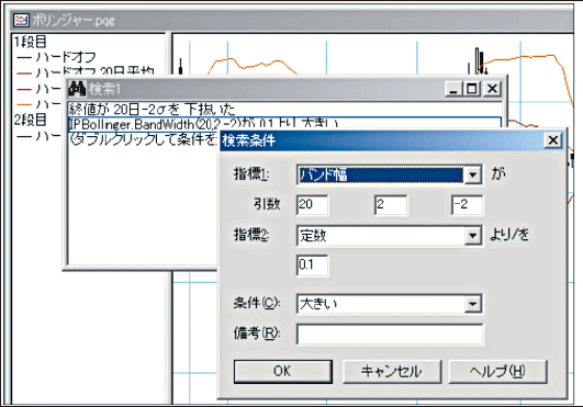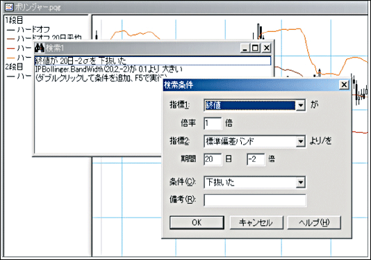 条件の設定方法は、指標1に「終値」、指標2に「標準偏差(20,-2)」、条件に「下抜いた」を選択し、OK