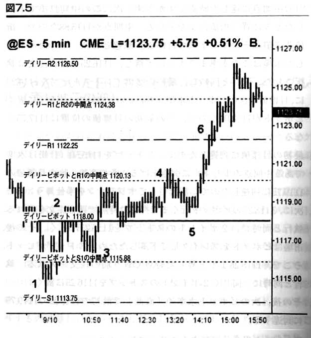 1.S&Pはギャップダウンで寄付き、デイリーS1に向けて下落(画像参照)。S1のすぐ上の1114.00に買いの逆指値を入れる。S1にかなり近づいたものの、S1まで下がらなかったため注文は執行されず、市場は反転して上昇し始める。市場がピボットとS1の中間点に達した時点ですかさず、次にこの中間点まで下落したときに買う指値注文を入れる。中間点が1115.88なので、指値注文はその少し手前の116.25。思惑通り、一旦上昇した市場はこの水準まですぐに下落し、1116.25の指値注文は執行された。執行と同時に、最初の2ポイントストップを1114.25に、目標値を次のピボット水準(中心ピボット)の「直前」に置く。ピボットが1118.00なので、この最初の目標値の位置は1117.25になる。