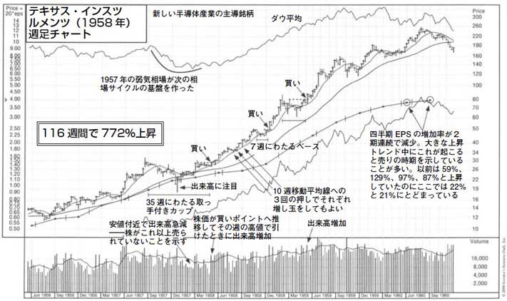 またそれ以外にも、これらの企業に関する当時の四半期決算報告書、過去3年間の年間収益の推移状況、出来高、株価が大きく上昇する前のレラティブストレングスの程度、各企業の総資本に占める発行済みの普通株式数、など、大事な要素を発見することになるだろう。また、成長銘柄の多くは、重要な新製品や新たな経営陣の存在が背景要因にあったり、産業全体で起こった大きな変化が原因で産業全体が強い流れに動かされていた、という事実も学ぶであろう。
