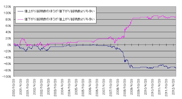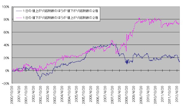 Î㣴¡¡Æü·Ð225¤¬200Æü°Üưʿ¶ÑÀþ¤è¤ê¤â²¼¤Î¤È¤¤Ë¡¢Ã;夬¤êÌÃÊÁ¿ô¤ÎÊý¤¬Â¿¤¤¤È¤¤È¡¢ÃͲ¼¤¬¤êÌÃÊÁ¿ô¤ÎÊý¤¬Â¿¤¤¤È¤¤ÎÈæ³Ó ¡Ê2000ǯ1·î4Æü¡Á2012ǯ6·î29Æü¡Ë ![]()