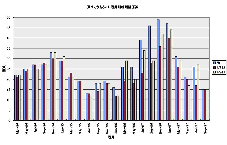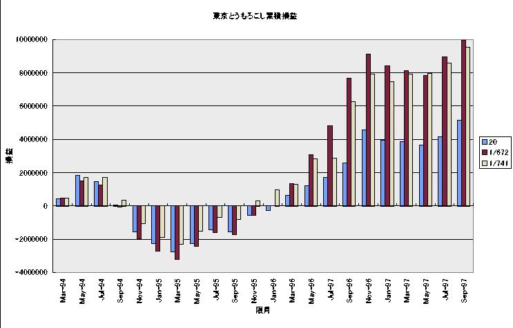 なお、刻ごとの新規建玉数の累計は、595 回 (20 円刻)、500 回 (1/672 刻)、 と 549 回 (1/741 刻) で、損益累計は 5,134,440 円 (20 円刻)、9,933,050 円 (1/672 刻)、と 9,557,930 円 (1/741 刻) であった。従って、一枚あたりの損 益は、8629 円 (20 円刻)、19866 円 (1/672 刻)、と 17409 円 (1/741 刻) で あった。
