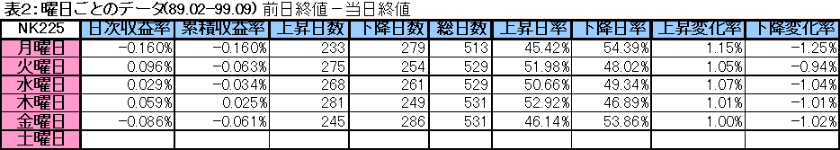 5日制に移行した1989年2月〜1999年9月までのデータを利用して再度計算しました(表2を参照)。