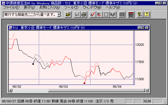 過去10年分のデータに基づき期先2本で分析、新甫発会直後は新旧線を並行表示します。
