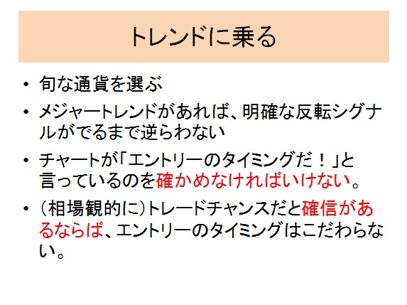 いろいろなパターンがありますが、本DVDでは確度が高く高勝率トレードのタイミングを、実践的に説明します。