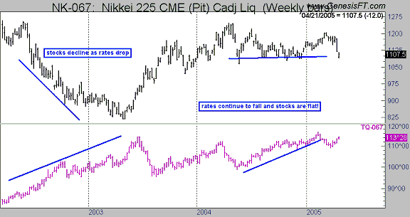 2002年と2003年に米国債の価格は強い上げをみせていたが、日経は下げていた。米金利の低下が日本株の上昇を引き起こすと言う意見を否定している動きが起きていたことになる。また、2004年の後半から2005年の初めにかけて、米国債の価格は上げていたが、日経には動きがなく横ばい状態のままだった。